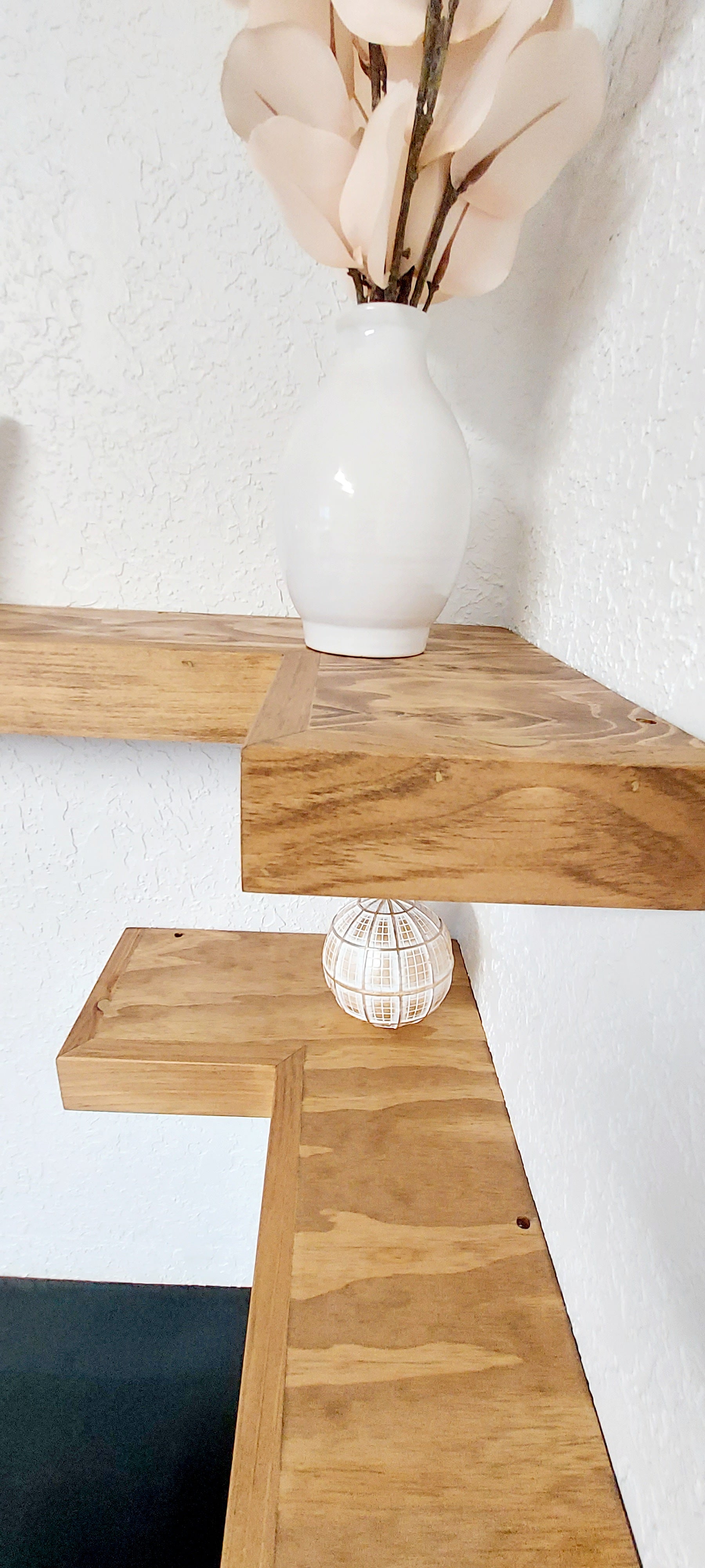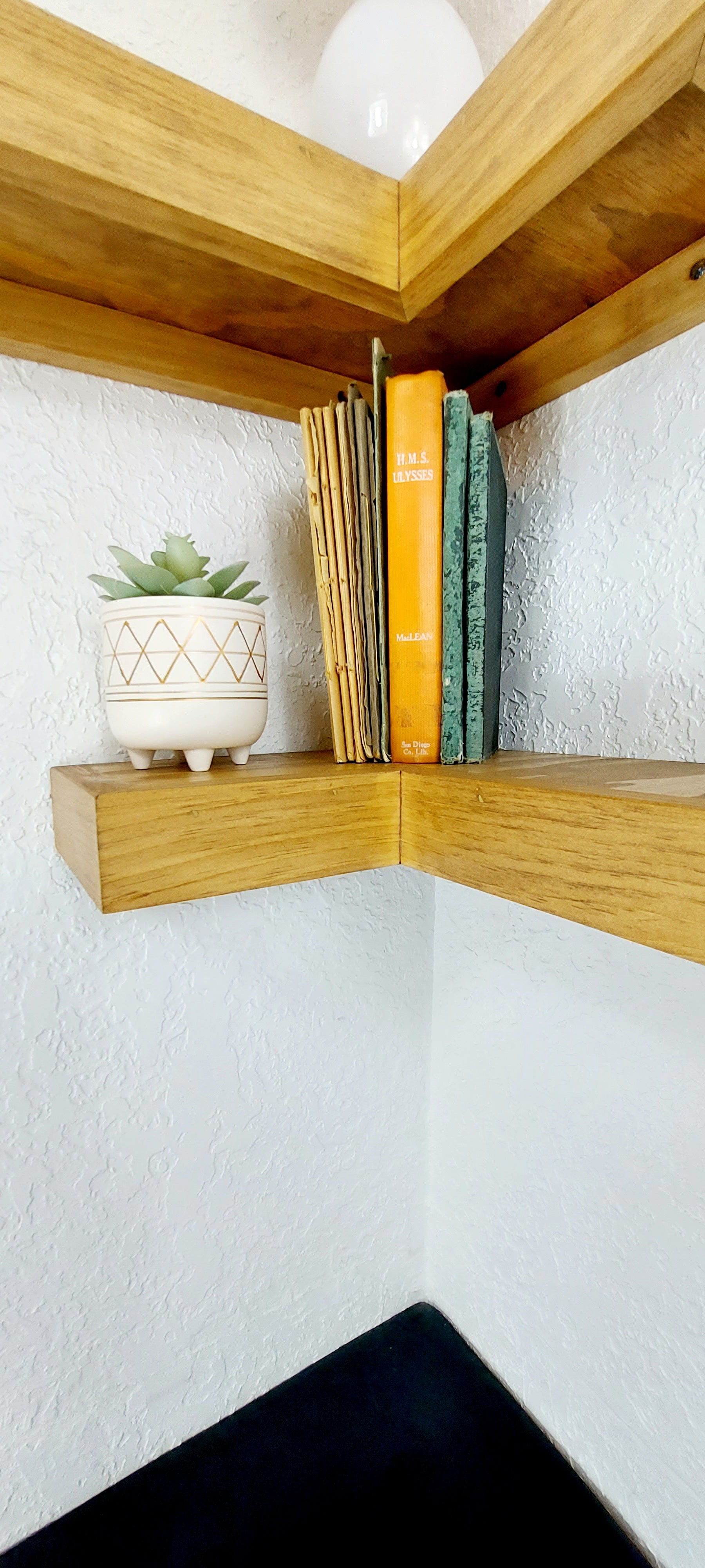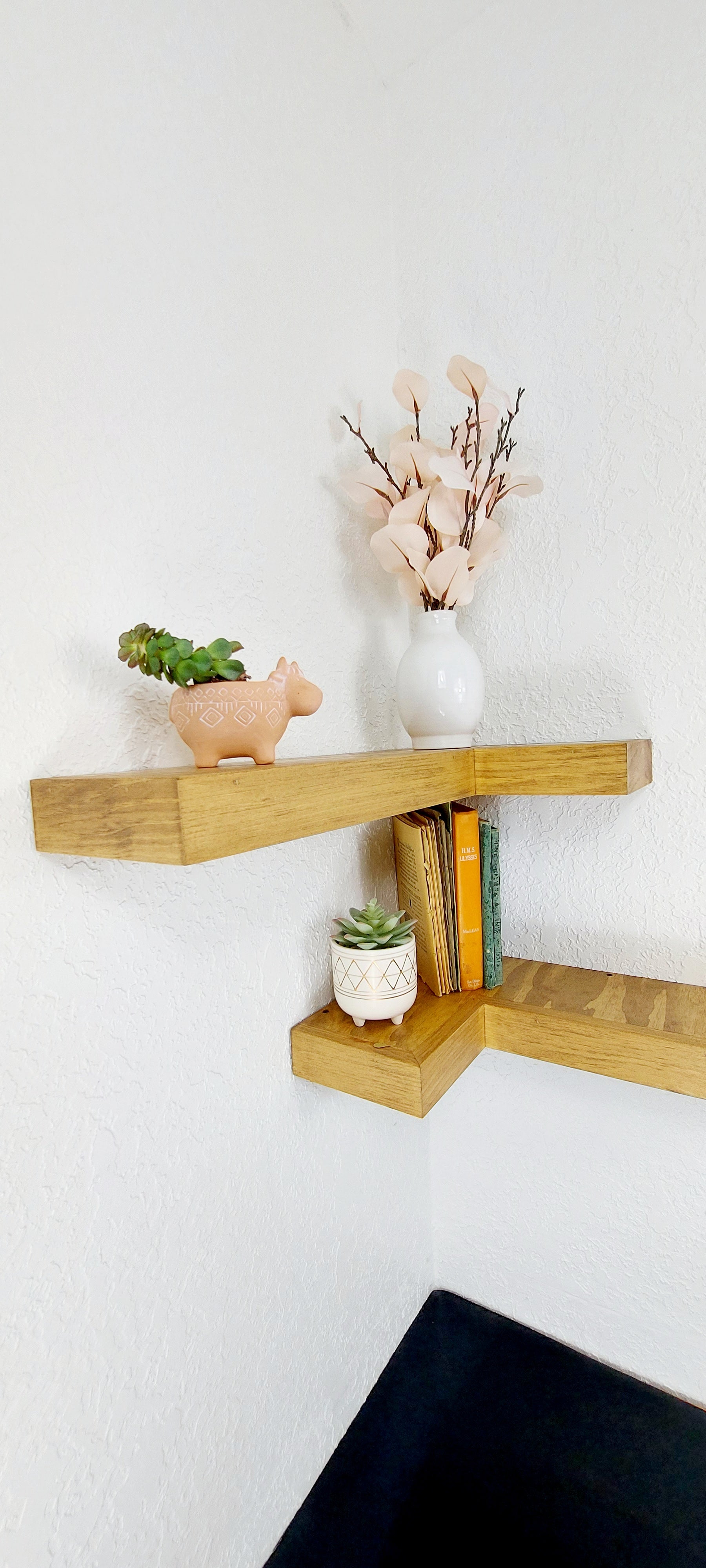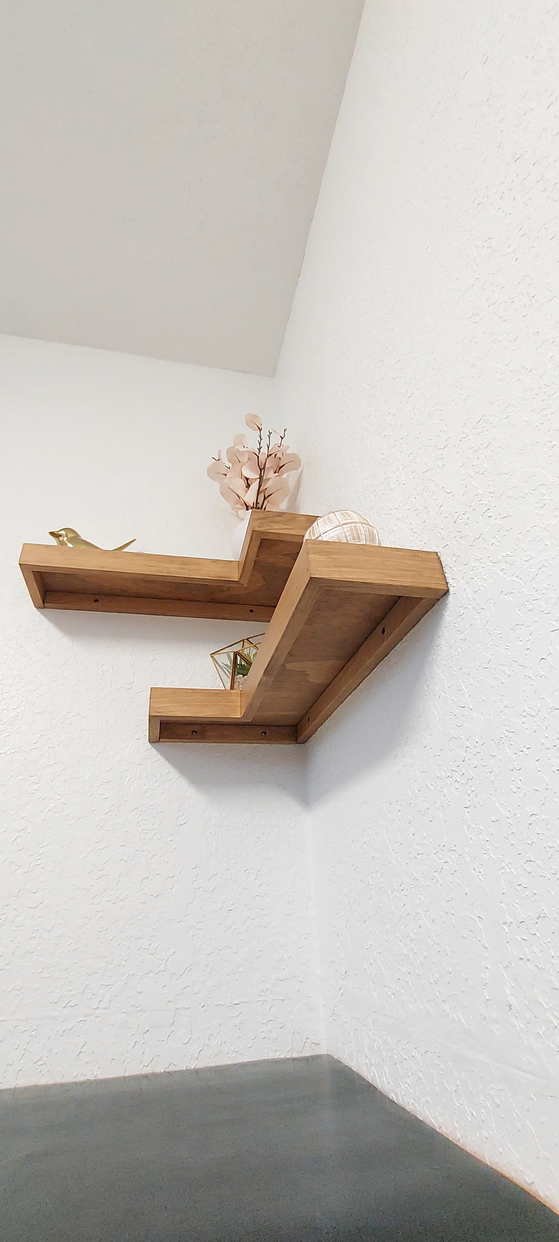 Beautiful rustic wooden corner floating shelves handmade out of pine. We can customize these shelves to any size you would like, just send us a message and we can work with you to bring your vision to life. These shelves are perfect to maximize space out of a corner in any room. They would look great as a corner mantel.